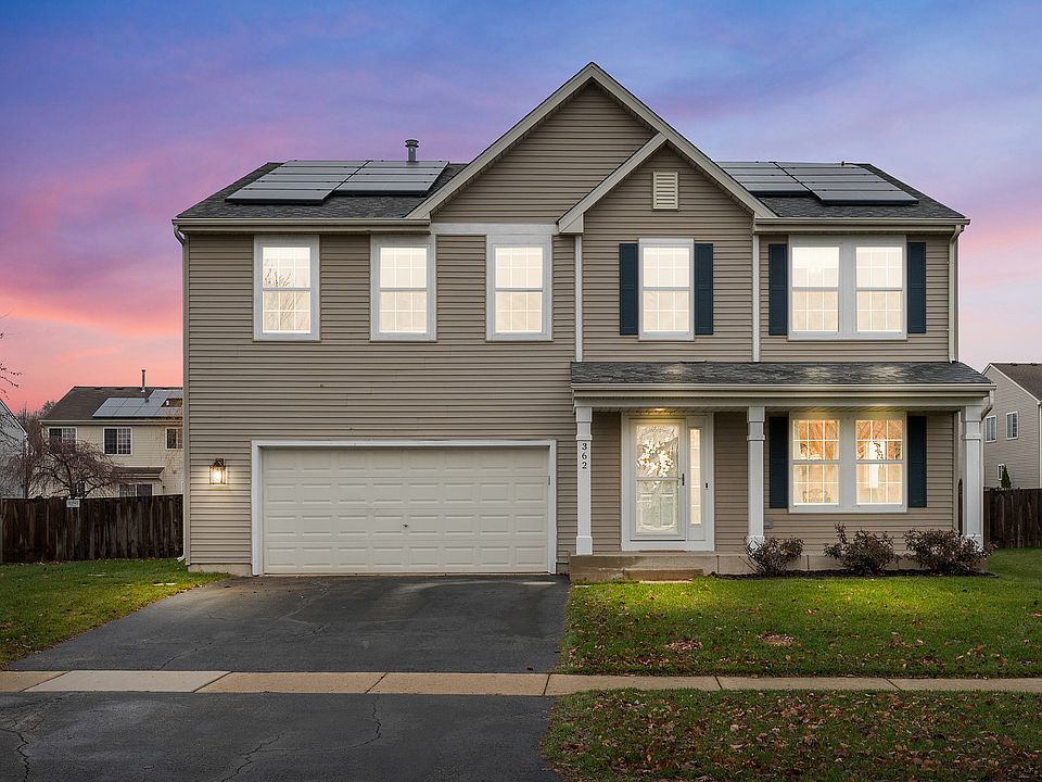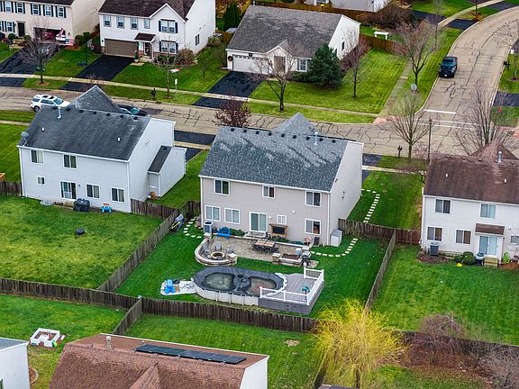 NESTLED IN THE HIGHLY DESIRABLE CAMBRIDGE LAKES SUBDIVISION, THIS BEAUTIFUL 5 BEDROOM, 2.5 BATH HOME IS CERTAINLY ONE YOU WON'T WANT TO MISS! Step inside to the spacious combined living/dining room with hardwood floors carrying through into the family room, the perfect place to relax taking in the warmth of the gas log fireplace with brick surround and wood mantel. Open to the totally remodeled kitchen with all new soft close cabinets, including two pantry cabinets with pull-outs, granite countertops, subway tile backsplash, high-end stainless steel appliances, and a wonderful island with plenty of seating. You will love creating your favorites here or enjoying your preferred beverage while gathering with family and friends! Completing this level is a half bath and 5th bedroom, which makes the perfect office space! On the second level you will be welcomed by a spacious bonus room. Currently used as a second family room, this could be an office, exercise, craft or study area. Need a 6th bedroom? This could be the place! The primary suite includes two walk-in closets, and an attached large, full bathroom with separate shower, soaking tub, double sink vanity, and ceramic tile! This level includes three more nice-sized bedrooms, abundant closets, second full bath with tub/shower, and a laundry room complete with washer and dryer. Need even more space? Check out the full basement with two egress windows and an ejector pit ready for you to finish as you wish! Attached two-car garage a plus! Abundant windows, white trim, ceiling fans, lighting and storage space throughout this home! There's more...You will feel like you are on vacation all summer long! Step out the sliding glass door to the impressive totally fenced-in backyard! Brick paver patio with retaining walls, fire pit, composite deck and above-ground pool! WHETHER INSIDE OR OUT, THIS HOME HAS SO MUCH TO OFFER! IT'S TRULY MOVE-IN READY AND WAITING FOR YOU TO MAKE IT YOUR OWN! UPDATES: Above-ground pool, pool deck, hot water heater, and first floor interior paint (2022), completely renovated kitchen (2021), new roof and addition of solar panels (2020), patio and fire pit (2018), and flooring and second level interior paint (2017). GREAT LOCATION WITH SO MUCH TO OFFER... CLUBHOUSE, COMMUNITY POOL, PLAYGROUNDS, LAKES/PONDS, BASKETBALL COURTS, EXERCISE FACILITIES, K-8 CHARTER SCHOOL, AND CLOSE PROXIMITY TO WALKING/BIKING PATHS, AND APPROXIMATELY 5 MILES FROM I-90 ACCESS. WHAT MORE COULD YOU WANT?