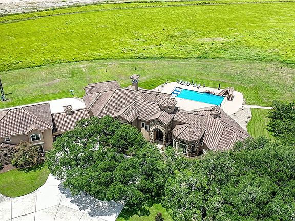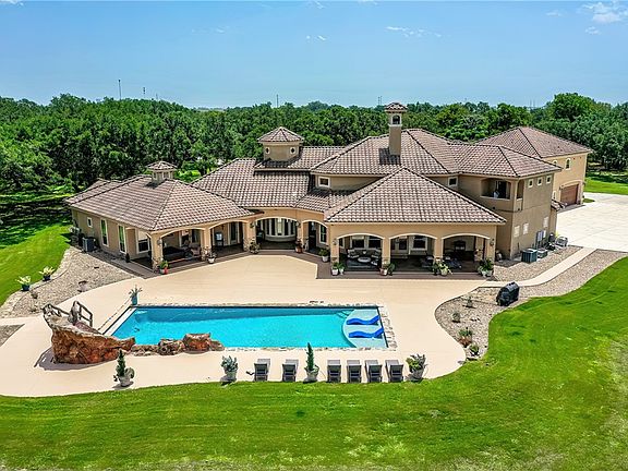 Outstanding 20 Acre, 10,000 SF under cover ranchette outside city limits but with all amenities nearby. This European inspired style Villa is a home you can't miss. As you drive through a gated entry for security, you will see the magnificent grounds and impeccable upkeep. Step inside the soaring entryway. First floor has a private main suite with sitting area, his and her baths, walk in closets, massage room and a wall of windows overlooking the landscaped yard and pool. A beautiful spacious library/office graces itself close by the suite for easy access. There is A half bath that is connected to the outdoors for ease of use when poolside. The Grand Room with double sided fireplace and 30 ft ceilings will take your breath away. Stone hearth fireplace one of 3, for cozy evenings when there is a chill in the air. The kitchen is a back to back full kitchen, so your private chef may prepare and you may have service from the front kitchen. Commercial appliances and amazing custom cabinetry round out the luxury of this part of the home. Built in coffee and ice maker. Huge Pantry. Large laundry are right off the kitchen. Dining room that can seat at least 12. Step out to the heated pool w/waterfall and a hot tub and enjoy the outdoors. Plumbed for a full kitchen and Pool cabana. Landscaping surrounds the home and 5 acres have a misting mosquito system as well as full irrigation so it's always green. Plenty of privacy. Now step back in and head up the winding staircase that really shows the Mediterranean Vibe. You will find 2 spacious bedrooms and baths and a full size media room with huge TV. Lots of storage throughout. Let's head to the exterior where the porte cochere brings us to the in-law apartment that has 3 bedrooms and 2 baths, with a kitchen and plumbing to make 2 separate units for a second kitchen. Have cars? No worry this home boasts a 4 car garage. 19 Acres are AG exempt. Many upgrades in the systems. Could be nice compound or commercial retreat.