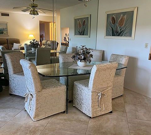 Condo located on Golf Course with a great Golf Course view. Includes washer/dryer, separate large storage unit, one car port space deeded with unit. Convenient 1st floor location. Access to top floor party room in building. Also, large pool and large clubhouse with many amenities. FULLY FURNISHED includes all furniture and appliances.