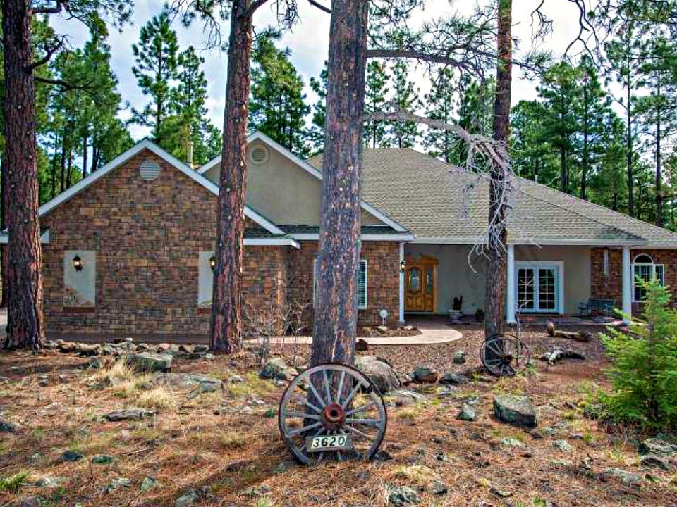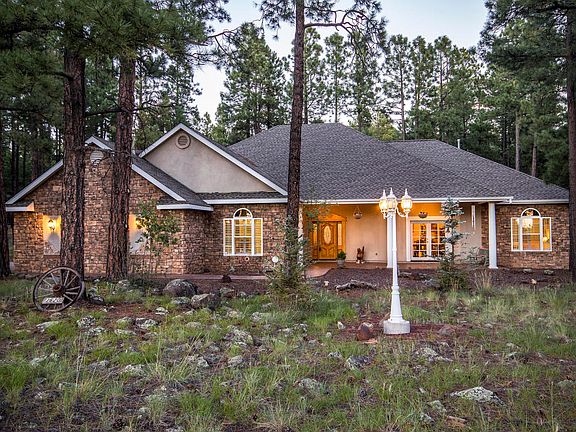 This is your opportunity to own a rare, impressively designed 3,150 sqft single-level home on 2 acres in one of Flagstaff's most coveted locations, Lockett Ranches. Serene Peak views greet you from the garage/driveway. The entry is guarded by a beautiful wood & stained glass door. As you step inside the home, comfort and luxury abound throughout. Stone fireplace from floor to ceiling, the great room opens to the porch and patio via the front and back French doors, great for entertaining family and friends. Kitchen features stainless steel appliances w/ professional Viking gas cook top, built in ovens, oversized island, lots of cabinets and a breakfast nook that peers out to the ponderosa pines. Upgraded with luxury additions of granite counters, Travertine flooring, Travertine/glass shower