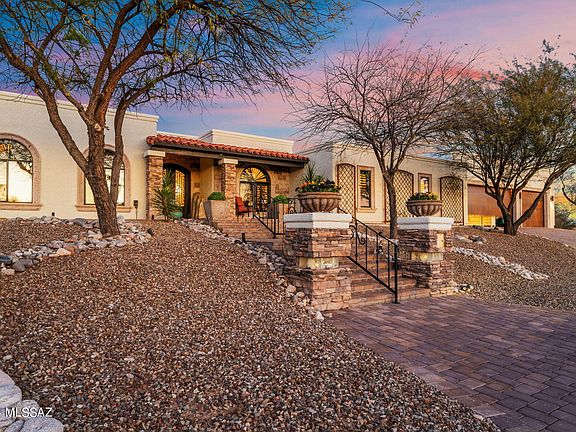 Welcome to this custom foothills home, with a stunning blend of beauty and function. The elegant stone finishes start outside with the paver walkways, front patio and stone columns. They continue into the home past the custom metal french entry doors. Travertine floors are perfectly accentuated by the plantation shutters, alder doors, and unique finishes throughout. The indoor spaces seamlessly flow into the backyard patios and outdoor kitchen. With a fourth bedroom off a separate living room and office space, the layout could serve as a private guest casita. The 1200 sq.ft garage ensure plenty of space for your cars and toys. This home offers a combination of timeless design with modern features you will not want to miss it.