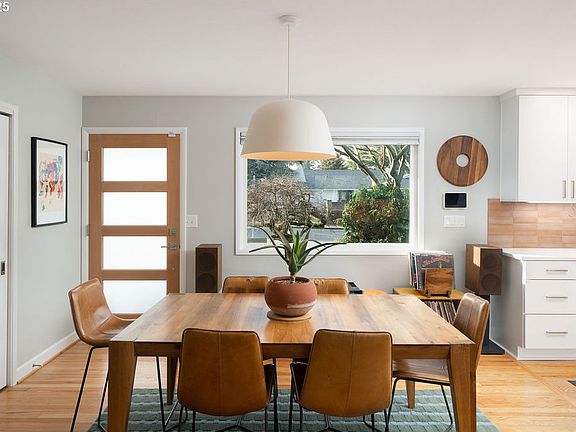 Nestled in the sought-after Argay Terrace neighborhood, this beautifully updated mid-century ranch is a true gem. Gleaming hardwood floors flow throughout the home, creating a warm and inviting atmosphere. The thoughtfully designed kitchen is a standout, featuring quartz countertops, a sleek tile backsplash, a Sub-Zero refrigerator, a Fisher & Paykel induction range, a Bosch dishwasher, a wine fridge, custom cabinetry, and stunning Schoolhouse Electric lighting—a dream space for any home chef.The living room boasts a large picture window overlooking the spacious backyard, a cozy gas brick fireplace, and sliding glass doors that lead to a patio perfect for summer entertaining. The updated guest bathroom offers modern elegance with a wall-mounted toilet, a custom vanity, and a tiled shower and bath. The primary suite includes a walk-in shower, while two additional bedrooms provide versatility—one with sliding glass doors that open to a paver path leading to a Bochky barrel sauna, creating your own private retreat.The newly fenced backyard is a meticulously maintained oasis with raised garden beds, year-round vibrant landscaping, and ample space to relax or entertain. This home also includes updated electrical, windows, and plumbing for added peace of mind.Located just minutes from Portland International Airport, Cascade Station shopping, parks, and convenient freeway access, this home offers the perfect blend of tranquility and accessibility. Don’t miss this exceptional opportunity to live in one of Portland’s most desirable neighborhoods! [Home Energy Score = 4. HES Report at https://rpt.greenbuildingregistry.com/hes/OR10105606]