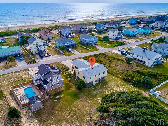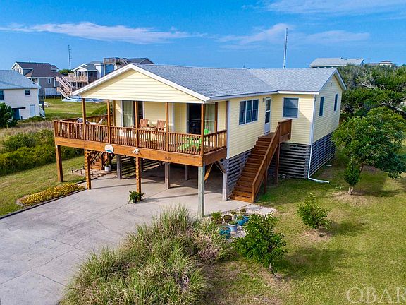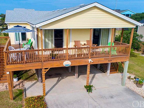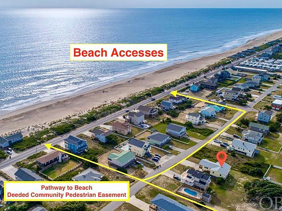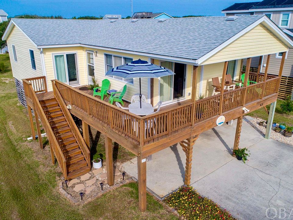 Situated on a large 10,000 sq ft parcel simply gushing with charm in extraordinary location close to multiple beach accesses. This sweet cottage retreat is far from your average beach box! No need to pack a cooler for lunch! Situated just 2 lots from the oceanfront, a pedestrian easement provides community beach access so you'll be back and forth in mere minutes. An open-concept Great Room overflows with character and showcases a striking vaulted tongue-and-groove beamed ceiling, lovely uplighting accents and a fantastic floor-plan which flows effortlessly to the covered front porch. With 1,600 sq.ft. of heated living space you’ll have plenty of room to spread out in 4 spacious bedrooms all with ample closet storage throughout. 2 exquisitely remodeled bathrooms bring a bright airy vibe finished with custom tile, new windows, wave-bowl topped vanities, sparkling glass door showers, new lighting, cabinetry, plus Kohler fixtures, tubs, & toilets. The main bedroom was updated in 2021 with fresh paint, new window, entry/closet doors, an Anderson sliding door was added to provide private deck access, plus custom room-darkening window treatments. Beautifully maintained by year-round homeowners the exterior features multiple updates with new low-maintenance siding, a large wrap-around deck, huge oversized carport and driveway lending extra parking, plus expansive storage/laundry/utility room beneath home just perfect for storing all of the beach essentials, bikes, & more with washer/dryer. The property is located in an X Flood Zone (no flood insurance required). The covered space under home provides an excellent location to gather out of the weather as you soak your worries away in 6 person Hot Tub or envision a new Tiki Bar addition complete with outdoor TV, dart board, games and more! With such close proximity to many restaurants, bars, and shopping, all you'll need to do is park and enjoy! A full list of home improvements available in associated docs, most recently: NEW roof 2019, NEW exterior vinyl siding 2020, two completely updated bathrooms 2021, multiple NEW windows 2021, NEW meter and electric box 2019, 55-inch wall mount Samsung smart TV w/Yamaha sound bar installed June 2023, NEW hot water heater 2021, NEW drain field and septic tank 2021 NEW washer/dryer and NEW range 2022, New a/c exhaust attic fan 2018. Don’t miss your chance to own a slice of heaven in the heart of Kitty Hawk- She will make your ‘soul shine’!
