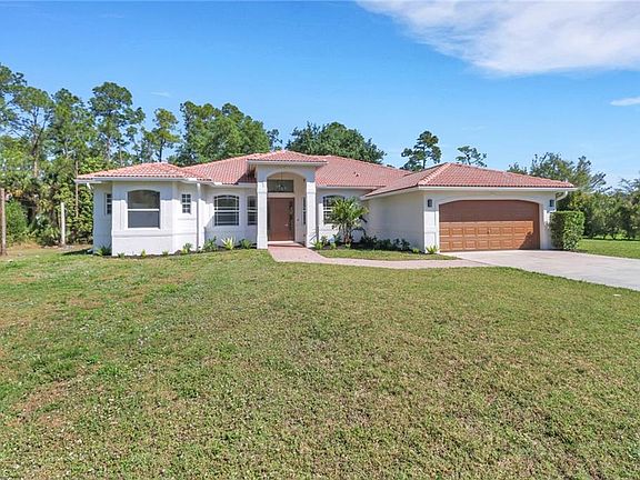 This remarkable single-level 4-bedroom + den home is nestled on a sprawling 2.5-acre lot, offering an exceptional combination of luxury and functionality. The open floor plan is highlighted by high ceilings and tile flooring throughout the living areas, with warm laminate in the bedrooms for a cozy touch. The updated kitchen is a chef’s delight, featuring granite countertops, a large center island, stainless steel appliances, and built-in cabinetry for ample storage and style. The formal dining room, breakfast nook, and separate family and living rooms provide versatile spaces for entertaining and everyday living. The spacious master suite is a true sanctuary, boasting two large walk-in closets and a transom window that brings in natural light. Outside, an oversized lanai invites you to enjoy the tranquility of the expansive property, while the garage features a sleek epoxy-coated floor for added utility and appeal. This home is perfect for those seeking a blend of modern design, thoughtful details, and serene surroundings.