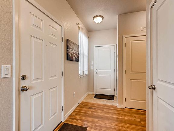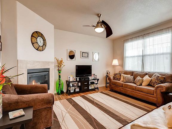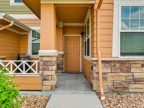 Gorgeous inside and out! This end unit boasts unbelievable views of Downtown Denver as well as the snow capped mountain chain. The large open grassy fields right outside the front door allows for zero disruptions of the beauty that Denver offers. Newly added hardwood floors welcomes you and spreads throughout the living space on the main floor! With the open floor plan and kitchen island, you can entertain comfortably! New carpet on the stairs and the upper level gives the home a warm touch, carrying you up to the 2nd level where you'll find more beautiful views from both the master suite & 2nd bedroom. Both bedrooms have their own bathroom! The Laundry room is conveniently located on the upper level with the bedrooms, making it easy to do that dreadful chore. Located near E-470, shopping and in a great school district!! Live like you have zero neighbors in this beautiful private end unit!