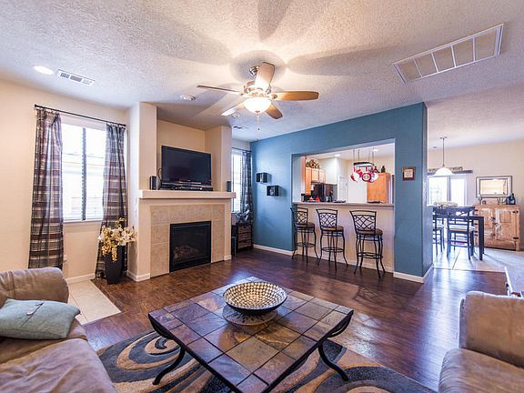 This 4 bedroom 2 bath home located right across from Rio Rancho High School features a spacious layout and private living quarters. Relax in the open living room warmed by a gas log fireplace or hop up to the bar in the giant kitchen complete with pantry, kitchen island, dining area, and natural light from the sliding backyard access. The living quarters consist of private bedrooms with large room sizes and spotless bathrooms. The master suite features a gigantic room size, two large closets, double sink, and shower/tub combination. Other features include 2 car garage, laminate and tile and carpet flooring, hot tub in backyard, and gazebo on the open patio in the backyard.