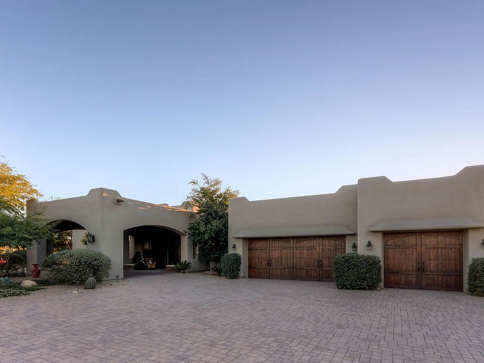 Recently updated and refreshed, Santa Fe style stucco and stone ranch style home. 1.7 Acre lot with close mountain and city lights views. Close to town but feels like the desert. Landscaping lights and putting greens add to the resort feel, when sitting around one of the two large fire pits or two outdoor fireplaces. Very large covered patio with barbeque, sink and stone tile bar. New pool, spa and stone grotto with waterfall with extensive exterior travertine pavers. Roof walk deck provides a territorial view of the Boulders and city lights. Pool heated by both natural gas and heat pump, powered by a large owned Tesla solar array and Tesla Powerwall batteries. Guest rooms and Casita have a private patio area with gas fire pit, just steps away from a large 20,000 gallon pool and spa. Main house has a extra large covered patio with TV, bar and fireplace. Upper deck over patio has another outside fireplace suitable for viewing the Continental Mountains, Black Mountain nearby and city lights.