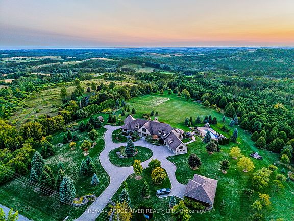 The Finest Country Estate in Northumberland County. Commanding 24 acres of rolling countryside with sweeping 360-degree views, this estate offers a rare combination of architectural mastery and natural beauty, just minutes north of Cobourg. Built with uncompromising craftsmanship, the 11,000 sq. ft. residence (7,500 sq. ft. above grade) blends timeless elegance with modern refinement. From the moment you arrive, the landscape sets the stage with meticulously groomed lawns, orchards, and stone installations by celebrated artisan John Shaw-Rimmington that create a sculpted canvas for outdoor living. At its heart, a resort-style pool framed by expansive stone terraces invites both grand entertaining and quiet retreat, while a private trail system winds through forested grounds to a hilltop lookout with panoramic views of Lake Ontario. Indoors, the residence impresses with a soaring great room 16-foot ceilings, marble columns, and a dramatic fireplace balanced by intimate spaces for everyday living. A Downsview-designed chefs kitchen, butlers pantry, and family room elevate both function and comfort. Seven bedrooms and six baths include a private 2-bedroom suite with it's own garage, while the primary retreat offers a dressing room, spa-inspired ensuite with heated floors, and sauna. Geothermal heating/cooling, an attached 3 car heated garage, a detached 2 car garage/shop and curated designer finishes complete this one-of-a-kind sanctuary. A true estate where architecture, landscape, and lifestyle converge at the highest level.