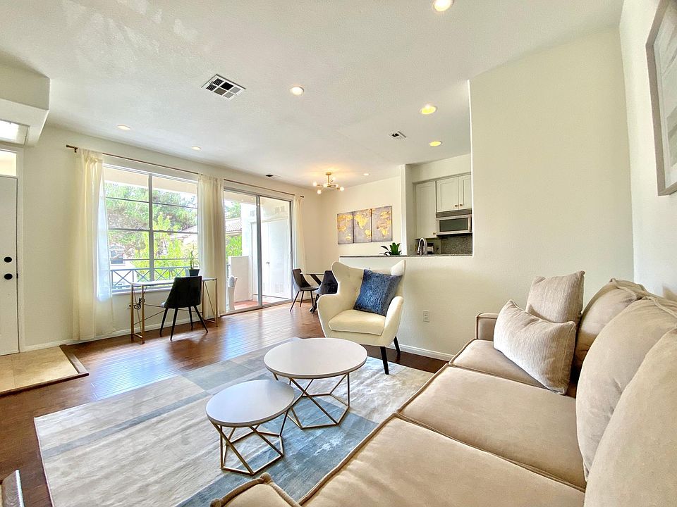 Executive rental in the desirable Del Mar Highlands complex of Martinique. Peaceful and serene, this light and remodeled second story condo is ideally situated within walking distance to to dining, shopping and nightlife at One Paseo and Del Mar Highlands Shopping Center. Commuting is convenient for Qualcomm and Sorrento Valley Biotech employees and it is just a short drive to the beach or Highways 5 or 56. The ensuite one bedroom home features a fireplace, balcony, stainless appliances with new dishwasher, and is freshly painted throughout. Beautifully furnished you will find a king bed in the master, pull out couch in the living room, desk, dinette and plenty of seating to enjoy the balcony. Laundry is in unit and this building is adjacent to the gym, pool and spa. Across the street is Solana Highlands Park and it's a short neighborhood walk to vista views of the Del Mar Racetrack and ocean. The condo is ready to move in now and is available for terms 30 days plus. All utilities and internet are included and there is one covered parking space. All utilities including internet are included. Lease term can vary from 30 days to one year; please call for pricing and options.
