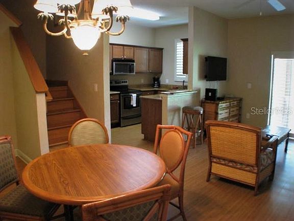 Outstanding updated 4 bedroom, 3 bathroom, 'fully furnished' town home, with separate lockout unit, Stainless Steel Appliances, Granite Worktops in kitchen and all bathrooms, Expensive Wood Slate California Blinds fitted throughout property, Freshly painted interior, Spa Bath in Master Bathroom. Located in the very much sought after Community of 'Regal Palms Resort', with the added advantage of being just across the way from the very popular 'Highlands Reserve Golf Course' facility. The Resort has 2 swimming pools, a lazy river, poolside bar, water-slide, beach volleyball court, an indoor and outdoor spa, steam room, sauna, fitness center, sports bar, restaurant, play areas. Regal Palms is located just minutes from Disney and all of the local attractions and within easy walking distance to a nearby Publix Supermarket shopping complex and restaurants. The property has laminate flooring fitted to entrance hallway, lounge and kitchen areas, Wooded Stairs and Rails. In addition to basic common area maintenance HOA Fees also includes Basic Cable, Phone, Internet, Exterior/Interior Pest Control and Lawn Maintenance.