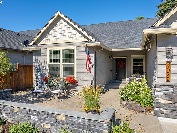 Pride of ownership on display in this lightly lived-in, 1-level, Wiechert home on almost 1/4 acre with incredible indoor/outdoor living & upgrades galore! Offering all of quality features and finishes that this builder is known for, this special property also has a professionally designed outdoor oasis that is a true showstopper! You'll love the stone patio, seating wall and flowering shrubs & trees in the front yard but the backyard will take your breath away. With a huge covered outdoor living room, extensive hardscaping, water feature, dry creek bed, newer hot tub, mature dogwood & maple trees, raised garden beds, full irrigation system and tool shed w/ power, your living space has been expanded and you'll never want to leave home. This is a true gardeners paradise with blueberries, raspberries, asparagus, tomatoes, hops, miniature apple tree, bay leaf tree, elderberries, mint, basil, sage, thyme, hydrangea, apple blossom clematis, lilies, orchids and gardenia. Inside you'll love the vaulted ceilings, open concept layout, great room w/ gas fireplace, gourmet kitchen w/ quartz counters and stainless appliances plus excellent separation of space. With 4 bedrooms total, the primary ensuite is your own retreat with attached bathroom, walk-in closet, dual vanity, new quartz counters (in both baths) and new stain resistant carpet. Other features include solar tubes, custom blinds, fresh interior paint, upgraded light fixtures inside, outdoor lighting, hardi-plank siding, gas furnace & water heater, A/C, attic storage in the garage, plenty of parking for RV or boat and feeds to 4J Schools! Immaculately maintained by original owners and completely move-in ready!