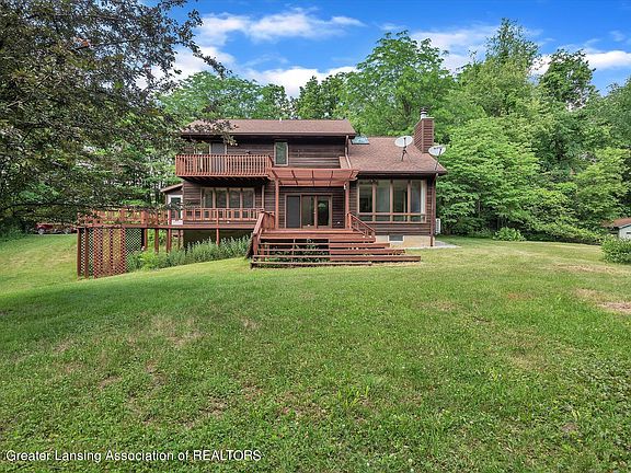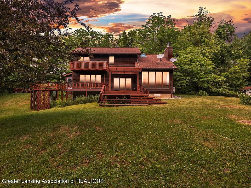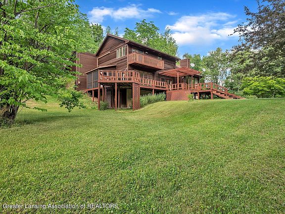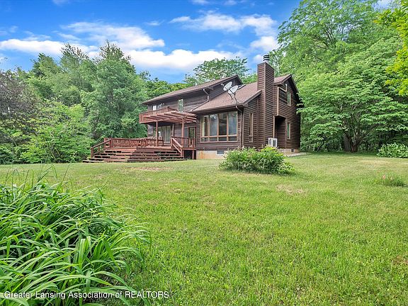 This gorgeous 4 bedroom, 2.5 bathroom home sits secluded on 10 wooded acres. Your dream home awaits, welcoming you down the long, private driveway. Walking in the front door, you'll love the open concept, zoned heating/cooling, and stone fireplace. The large living and dining rooms are lined with tall windows and sliding doors overlooking a spectacular deck with an even more spectacular view! The views from the spacious kitchen will feel like a vacation. First floor laundry, half bath, and a bedroom/office are convenient additions to the first floor. Upstairs you'll find a huge main bedroom, complete with en suite bathroom and walk in closet, two additional bedrooms, and a second full bathroom. Outdoor living is a dream with the huge multi-level wraparound deck and 20x16 pole barn! Offers due 6/18 by noon