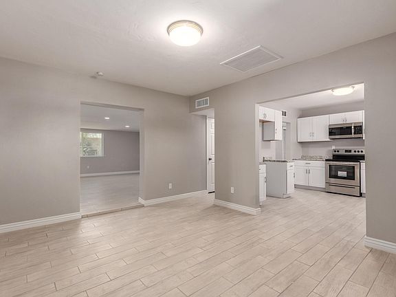 Gorgeous Remodeled Mid-Century Modern Home! Spacious open floor plan, handsome new wood ''look'' tiled floors, new soothing palette, new baseboard, recessed lighting, & interior laundry room. Stunning new kitchen features new stylish counters, new SS appliances, & plethora of new white cabinets w/hardware. The great room is perfect for entertaining. New plush carpet/padding in all bedrooms, upgraded ceiling fans, vaulted ceiling in master, ample closets, & 2 upscale baths w/new counters, fixtures, & designer tile. Large backyard w/a covered patio, shade trees, & room for a pool! Near Shopping, Dining, & more. Take a tour & stop renting!