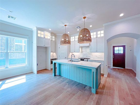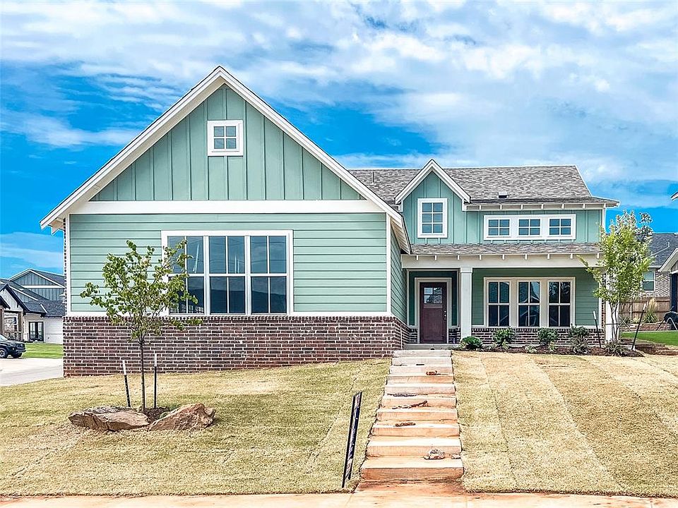 Come tour this adorable Modern Farmhouse sits on a corner lot in our sought-after community, Town Square! The open concept layout in our Emerson plan draws you from the entry way into the living room filled with natural light. The living room features a a vaulted ceiling with beams, a stone fireplace and site finished wood flooring. Kitchen has everything you need with a large island that overlooks the dining space. You will be in awe at the grand feel in the study with the 14ft ceiling! The owner's retreat has a tray ceiling, double vanity, tub, large shower with spa glass door and a walk-in closet. This adorable home has 3 bedrooms, 2 baths, a study and a 3 Car Side Entry Garage. Home is under construction - to be finished Early Summer. Town Square is Edmond's historically inspired community featuring a clubhouse, resort-style pool, fitness center, youth rec center, playground, community garden, wooded green belt with walking trails, and a lake with a fishing dock.