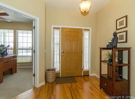 Welcome home to this bright & open rancher located in desirable Summerfield at Briargate. Walking distance to Academy International elementary school, John Stone Park & walking trails. Newly refinished warm hardwood floors greet you at the entry & flow throughout the living room, dining area, & kitchen. The covered porch entry opens to great room boasting 9'+ ceilings & a wall of windows letting the natural light pour in illuminating the open airy space. The dining space has upgraded lighting & easy access to the kitchen.