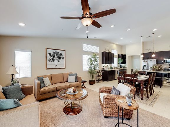 Drive through the gates of this prestigious Tournament II community to your new home. Once in front of the home you will be welcomed by the beautiful landscaping and the covered entry. Once through the door the open floor plan takes your breath away. Straight ahead is the large gourmet kitchen with granite counter tops and ample space to cook large family meals. The tiled floors, dark wood cabinets and island add a touch of elegance that even the pickiest chef will be proud of. Next to the kitchen is a room that could be a formal dining room or easily converted to a 4th bedroom. The Living Room rounds off this open floor plan with upgraded carpet and padding that adds to the luxury feel that this home provides. The Master en-suite is large enough to have any sized bed and still have room for furniture. The adjacent Master bath has a soaking tub, separate shower and dual vanities, the tranquility abounds this home. Meander to the other side of the home and you will find 2 very good sized rooms with a full bath, indoor laundry room and direct access to the garage. Let us not forget the backyard that has been fully landscaped with lush grass, planters and easy to maintain plants. Don't let this piece of heaven escape you, make your appointment now for your personalized viewing.