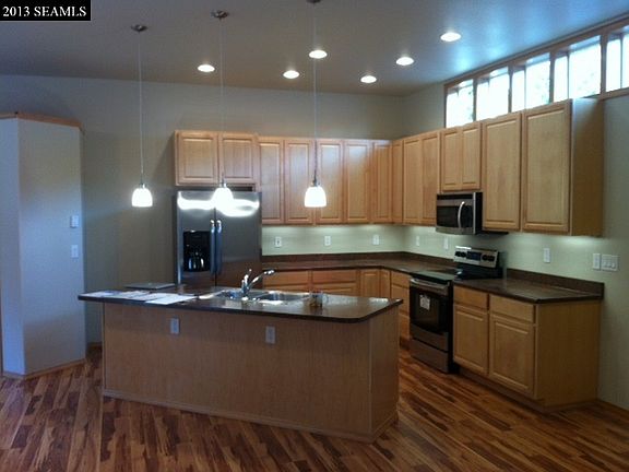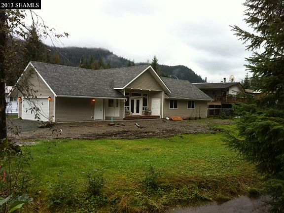 This is a brand new affordable beautiful house facing duck creek ( a salmon stream). It has an open floor plan, 10 foot ceilings, and three large bedrooms. Two of which are master bedroom size. One level, so no stairs; and a large lot. Close to bus line and stores on quiet side street. Garage will fit two large cars.