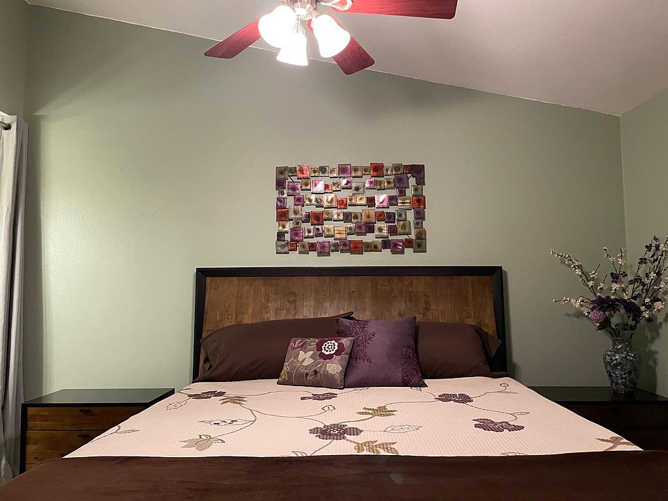 This beautiful furnished attached home located on a private, quiet cul de sac is just four miles from the beautiful Carlsbad State beach, 45 min to Disneyland, and 35 min to downtown San Diego. The room has a cal king bed, private bath, mini fridge, keurig, microwave, chair, Roku TV, and free wifi. Breathtaking views of sunsets from your room and the backyard. The entire home is shared space with our two male professionals. Each bedroom has a keypad entry lock. The kitchen is fully stocked along with designated space in the refrigerator and pantry. The fully finished garage is available if you need extra space to store any larger items as well as an ergonomic chair and desk. WE ARE LGBTQ+ FRIENDLY. Price includes utilities, wifi, and designated driveway parking spot. Month - to - Month - 30 day notice for landlord or tenant WiFi and Utilities Included Electronic Payment Method Damage to items refers to any item that is not fixable or usable from within the room or bath. One day notice given via text if landlords will be entering property. Keep the premise clean and repair any damage caused by neglect or abuse. Landlord will maintain property and repair any damage not caused by renters. Property manager lives on premise and can handle communication with landlords. Subleasing not allowed. No animals allowed - other tenant is allergic to cats and dogs. Guests may visit for no longer than 7 days. Any visitor that stays longer than 7 days must be pre-approved. No smoking inside the home or near any open windows. Other tenant living in the home has asthma. Grounds for lease termination and eviction: Excessive Noise, large parties, drug dealing, underage drinking, violence against other tenants, purposely damaging property or self.