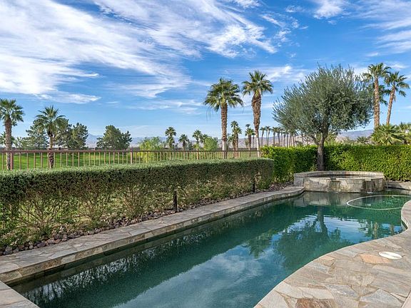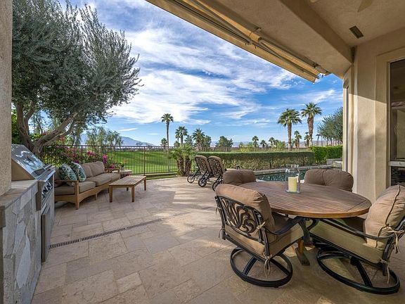 Sun City Palm Desert- Provence. This estate model home is as elegant and grand a home you will find in Sun City. The home is exquisitely appointed both inside and out. The rear yard sits elevated over the 4th fairway providing panoramic golf course and mountain views. The pebbletec pool and spa is surrounded by a flagstone patio. The 10ft glass slider at the family room retracts to create an indoor/outdoor living area as the limestone tile flooring from inside continues to the leisure area of the rear patio w/built-in BBQ & retractable awning. Inside, 12ft ceilings are in all living areas & the primary suite. A semi-circle of 10ft windows is the signature feature of the greatroom providing views for miles. Limestone tile flooring is used extensively. The spectacular kitchen has a huge island w/seating, granite counters, stainless appliances including a Sub-Zero refrigerator; extensive kitchen cabinets w/pullout shelves. The study/office has crown molding & built-in shelving. The luxurious primary suite has crown molding and a huge walk-in closet with built-in storage. The primary suite bathroom has a custom tile floor, dual sinks mirrors w/inset lighting, a custom stall shower w/dual shower heads, an oversized tub; all with polished travertine surfaces. The guest suite is on the opposite side of the home. The powder room has a floating vanity with indirect lighting. The extended 2+ golf cart garage has built-in and hanging rack storage. The home has dual Lenox AC (new 2018)