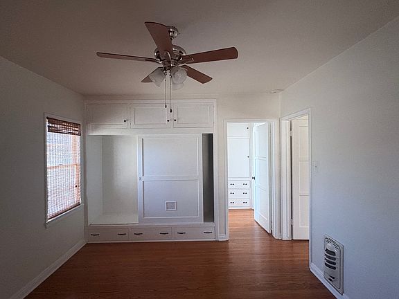 The 1 bed unit features hardwood floors throughout, abundant natural light, ceiling fans, a large living room, a large bedroom with ample closet space, a hall closet, and a kitchen with built-in cabinets and eating area.