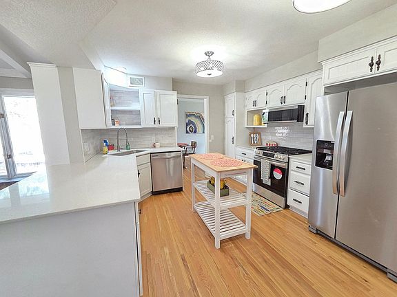 Welcome to this charming 4-bedroom, 2 bathroom rambler in the highly sought after Minnetonka school district! This home offers a bright, spacious layout, perfect for both entertaining and everyday living. Step into the inviting living areas, including two cozy family rooms, a formal dining room, and a lovely three-season porch that brings the outdoors in-ideal for relaxing or hosting gatherings. The open-concept kitchen is a chef's dream, featuring custom white cabinets, quartz countertops, and brand-new stainless steel appliances. The home boasts beautiful refinished wood floors, a cozy fireplace, and large windows that bathe the space in natural light. Three bedrooms are conveniently located on the main floor, along with a beautifully updated bathroom with tile work and fresh finishes. The lower level is finished and includes and additional bedroom, a bathroom, a large family room, and a bonus room-perfect for a guest room, office, or workout area. You can access the basement through the main house or via a side door, adding to the home's convenience. Many updates throughout, including fresh paint inside and out, new carpet in the basement, and a new asphalt driveway.