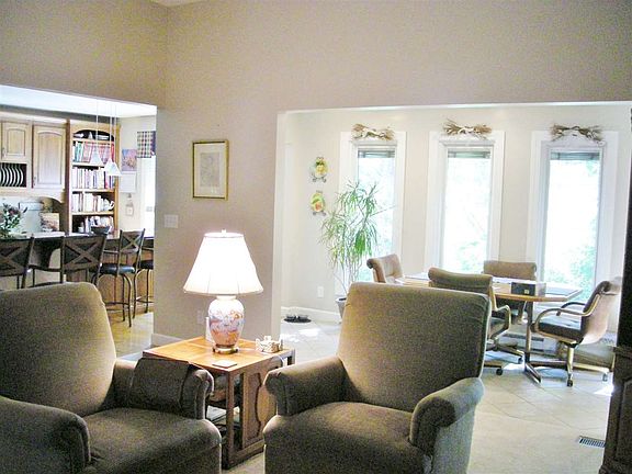 You'll LOVE this maintenance provided home! Great open floor plan, living room, dining room & front BR have 10' ceilings. Gas log FP. Efficient kit features hickory wood floors & many hickory cabs w/Silestone counter tops, island & newer stove & microwave. Master suite BA w/separate shower/jetted tub & double vanity. Take special note of the 3' door openings. Walkout basement area includes family rm, BR & the 3rd BA. Walkout to a bricked patio area & enjoy a touch of mother nature. Sprinkler system too!