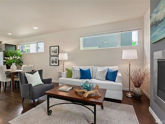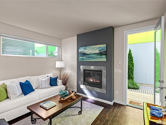 Stunning modern townhome, built in 2016, nestled on quiet tree lined street in Mount Baker neighborhood. Frosted glass doors and windows welcome you to open concept kitchen, dining, and living space. Quartz counters, designer tiles, stnlss steel appliances, with deep in-counter sink. Comfy living with gas frplc. 2nd floor boasts 2 bright bdrms and a full bath w/ beautiful fixtures. Top floor master bed with private balcony that gets evening sunsets, walk-in clst & 3/4 bath w/ prvt toilet room.