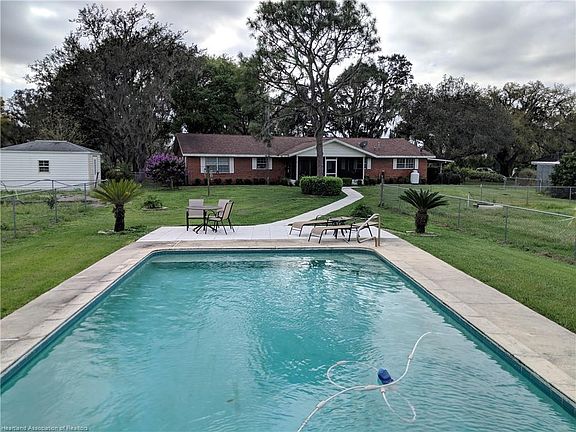 Well kept brick home in a very desirable area situated on 16.4 beautiful acres in eastern Hardee county. This 3/2 features spacious rooms and a back porch with a view to die for and a huge in ground swimming pool with diving board for great family gatherings! Roof is new in 2013, a/c in 2018 and large back yard is completely chain link fenced. Includes 25x48 pole barn and two storage sheds measuring 12x24 and 10x16. There is a nice new set of cow pens with a WW squeeze chute. Fenced and cross fenced with a penning lane. 4 inch well provides great water. Approximately 1/2 acre fishing pond. Deer, hogs and turkeys can be seen daily from the back porch. Beautiful improved pasture with a cypress head in the back. The property is in a great location just minutes from Highlands Hammock State Park!