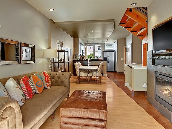 Richly textured with floating staircase, illuminated glass mantle, custom metal railings, Fir beams and river rock flooring in the master shower, this meticulously crafted townhome boasts an enviable location right in the heart of Fremont.  Dramatically different, this is a home with everything and anything except the ordinary.  Fresh, innovative styling makes a beautiful impression throughout.  The large kitchen, with slab granite countertops, stainless appliances and pantry, is as beautiful as it is functional.  In floor radiant heat in gypcrete, 170 square feet of  south facing roof-top deck with adjoining loft space -- these provocative features and more provide an extraordinary environment.  Add to this distinctly designed home a Walk Score of 85 and the result is an experience of pleasure, comfort, convenience and a lifestyle beyond expectation.