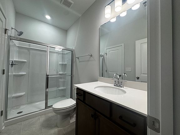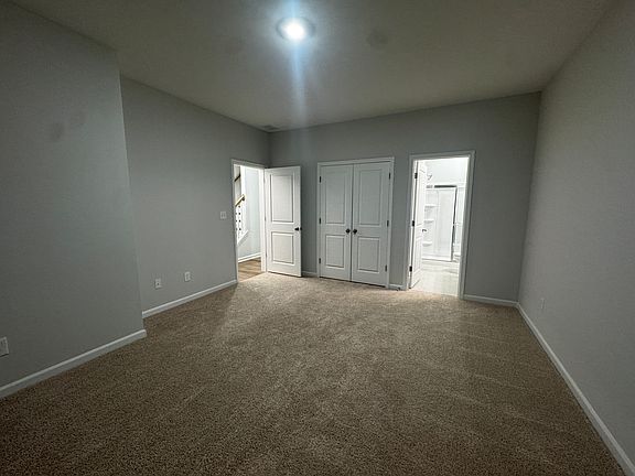 This modern three-story townhome in Garner offers a private first-floor bedroom with its own full bathroom. The suite is separate from the main living areas, providing convenient access to the entryway and driveway parking. The room features updated flooring, a spacious layout, a digital door lock, and a private full bath attached to the bedroom.