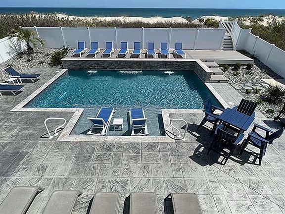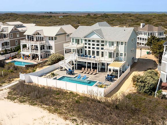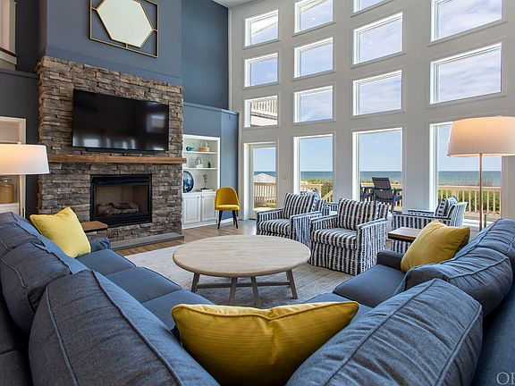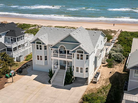 Edgewater View is a stunning 10 bedroom, 11.5 bath oceanfront retreat in Corolla! Sporting a new outdoor living area, new saltwater pool and a recent major expansion and upgrade of the interior spaces, this prime vacation home is crisp and contemporary! You'll be floored by the two-story wall of windows framing panoramic ocean views. Along with soaring cathedral ceilings, these vistas are the highlight of the immense great room, which is strategically located on the mid-level to create a wonderful flow. The great room is filled with rejuvenating natural light, filtered through a bank of floor to ceiling oceanfront windows and enhanced by the warm hardwood floors. Panoramic ocean views are the backdrop to the living and dining areas. The home is designed for maximum comfort for all of your guests by offering multiple living areas including a spacious office/lounge, arcade, a full theater, and a generous game room. With the kitchen, dining and living rooms on the midlevel, the panoramic views are incredible, the two story bank of floor to ceiling windows bathe the home in natural light, and living is easy with fewer steps (and an elevator)! The kitchen is extremely well equipped for large families featuring stainless steel appliances (two dishwashers, double ovens, a six-burner cooktop and two full refrigerators with icemakers), custom cabinets, quartz countertops and a center island. Four king ensuites on the mid-level include an oceanfront king with water views, direct covered deck access, and walk-in closet and a private bath with a dual sink vanity and soaking tub. The top floor is dedicated to private bedroom suites arranged around views and a private lounge. The hallway is open to the great room below and enjoys the same natural light and sweeping ocean views. Bedrooms include four stylish king ensuites, including two with private oceanfront balconies. There is also an additional ensuite bedroom with 2 pyramid bunks on this floor. Indoor and outdoor entertainment options are the highlight of the ground level which features a rec room with a pool table, Skee-ball, shuffleboards as well as a sports bar with a commercial-style ice maker, full size fridge, dishwasher and microwave. A theater on this level with a 120'' screen features immersive surround sound with 8 speakers. You'll also find an arcade area with a full bath that also connects to the outdoor area. A door separates the family suite area from the rest of the ground level. This suite includes a king bedroom, bedroom with a daybed and trundle, and a shared full bathroom. A laundry room with two washers and dryers completes this level. The fun continues past the covered outdoor patio with a stunning oceanfront heated private pool, outdoor ping-pong table, hot tub, cornhole and two outdoor showers. The raised sun deck, waterfalls and landscaping set the picture perfect stage for your family and guests to enjoy. The home was upgraded and expanded in 2021 with professional interior design and the pool and outdoor living area were completely redone in 2022. The award winning Pine Island Community has strong protective covenants, a robust dune management program and owners committed to maintaining the neighborhood’s premier status. The adjacent beach is very private and far from public access. This site has exceptional width and depth, a private culdesac location, and a large protective dune that does not block views. Opportunities like this to check every box are rare. Vacationers love this home and it is on track to achieve well over $600,000 in 2023 rental income! Come see why there are so many repeat guests, including FIVE families staying again in summer 2023! See floorplans and more details and pictures online at Carolina Designs Realty #744. Call the listing agent for more information about this home, 2024 rental pricing, operating expenses and more!