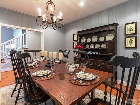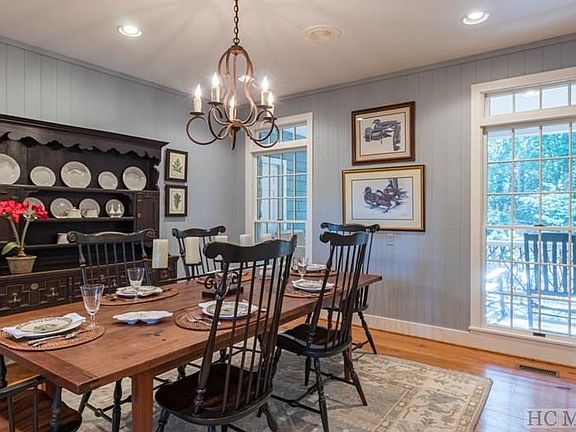 Redecorated lakefront home with new wood floors and light paint scheme, this 5 bedroom /3 1/2 bath family home, on +/-3.7 acres lushly landscaped property is close to Panthertown (6700 acre park.) The home has frontage on "Albert's" pond and Logan Branch stream, and has year-round mountain views of Bear Mountain and Double Knob, especially enjoyed from the spacious decks, screened porch, and many windows. The Greatroom has cathedral ceilings with exposed beams,a massive stone wood burning fireplace, bookshelves flanking the fireplace, wall of windows overlooking the lake and mountains, even remote shades, and there is another fireplace in the paneled living room. Dining room.The gourmet kitchen has a huge pantry,stainless appliances and granite counter tops, and an a downdraft ( instead of exhaust hood). Built in Bar with granite. Large master suite is on the main floor, walk in closet, spacious bath with double vanities, shower and garden tub in the spa room with mountain views. One guest suite is on the main floor, and upstairs there are three bedrooms and one bath. Additionally there is a loft and playroom with bunks upstairs. Office and laundry are on the main floor. Many interesting upgrades through out: Stone exterior on the front covered entrance porch, generator, central vacuum, high ceilings and lots of storage are extra bonuses. Large 2-car garage and workshop in basement. Chair lift from the garage to the main level. It has a private well. Cool summers at 4000 feet in elevation. This home has Chinquapin amenities; 25 miles of hiking trails,picnic area and rights to Wolf Lake. Pured cement walls.