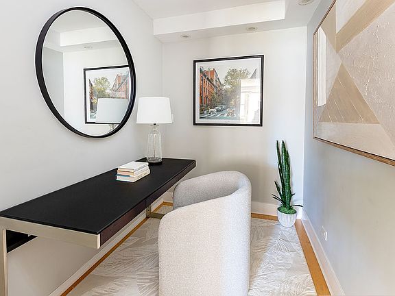 A king sized corner primary suite has both south and west exposures allowing for brilliant light and partial skyline views. There is a large outfitted closet including a floor safe.