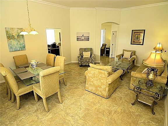 Fantastic 3 bed 2 bath fully furnished home with west facing heated pool (electric pool heater and solar heating). Spacious open floor plan with formal dining and living room. Upgraded Granite countertops and tile flooring throughout the home. Remodeled bathrooms and kitchen. Kitchen features stainless steel appliances and upgraded cabinetry. NEW ROOF installed Oct 2020, New A/C 2016, and New Hot water heater 2019. Located in the exclusive Highlands Reserve golf community, close to restaurants, shops, and area theme parks. Low HOA fee. In addition to the golf course, community features include Tennis Courts, playground, and community pool. This home is perfect for a primary residence due to its central location or as an investment / secondary home.