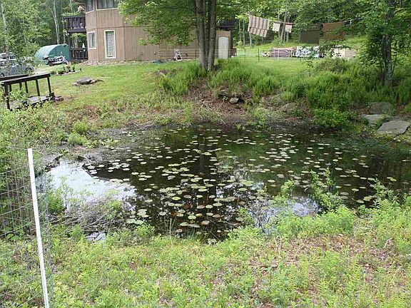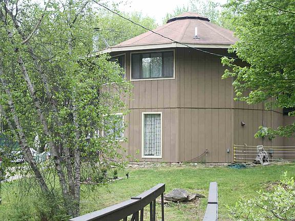 what a unique house with 12 sides and all useable space...3 bedrooms 1 full bathroom with a unique floor plan...2 bedrooms downstairs with a living room and a pellet stove ..upstairs is a woodstove, kitchen with an island , and master bedroom with a deck overlooking the property, great place for your morning coffee.fenced in yard for your pets..outbuildings and a pond with a wooden bridge over the water which has lights on it for the evening walks ..nice lawn and there's 2 parcels..house sits on one parcel and the pond which is spring fed on the other parcel..first time on the market ..this one is a must see..very economical to run ..weekends or year round..
