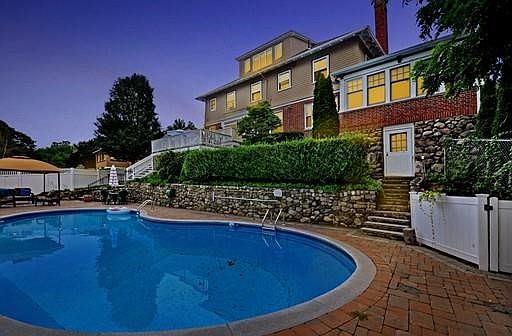 This Grand Dame is situated at the heart of the Mystic Lakes and has water views and so much more! Enjoy an impressive entrance with original woodwork throughout " hardwood floors, an irresistible window seat, built-in cabinets, and intricate moldings. The main level has a sweeping staircase as grand as they come, fireplaced living room w/ beamed ceilings, family room & dining room with beautiful doors leading to a deck. There is an updated eat-in kitchen w/ stainless steel appliances, granite counters, and plenty of cabinet space. Upstairs has 4 large bedrooms (one w/ fireplace), ample closet space, and the master has an updated bath w/ double sinks, steam shower & skylight. Spacious bonus room on the 3rd floor is a fantastic game room or office! The lower level has a game room, half bath and home office/studio. There is a gorgeous wrap-around deck w/ amazing views, a luxurious in-ground pool and 2-car garage. Nearby Medford Boat Club, Bishop School, Arlington Center. This is lovely!