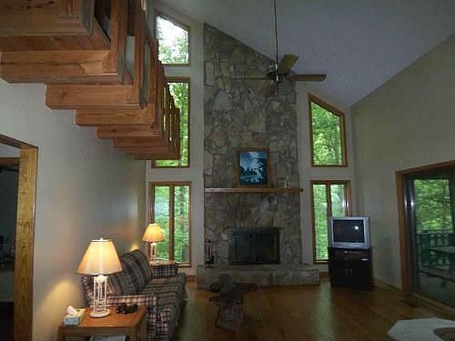 Estate sale! Very Private and wooded setting on 6.7 acre. Three bedrooms, two baths, cathedral ceilings, wood floors, striking stone fireplace floor to ceiling, loft, and bonus room. Two-car garage. Large master with tile shower, Anderson Windows, very well built home, just needs a little TLC. Garden spot. Very private and gentle land.