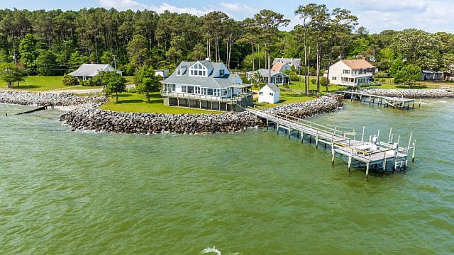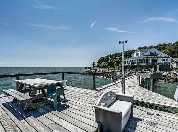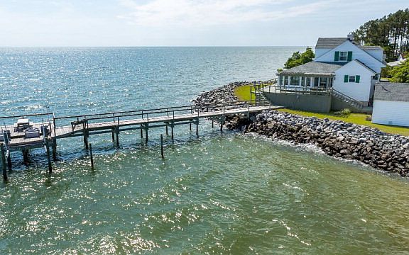 'Land's End' is truly a one of a kind property at the confluence of The Rappahannock River and The Chesapeake Bay. The panoramic views are the BEST we have ever seen. The main home circa 1940 has many original features such as heart pine floors, extensive woodwork, charming nooks & crannies and unexpected treasures. The home has had thoughtful updates and upgrading over the years without losing any of its original charm. The main home features delightful modern kitchen with granite and stainless and cabinet enteriors are all new with refinished original cabinet fronts. There are 4 bedrooms in the main house including a romantic waterside master with endless views. There is a new garage with guest suite above which includes full bath, kitchen, waterside deck and large sleeping/living area. A wonderful small sand beach, pier with boat lift and better than 5' mlw. Fishing and crabbing from the dock yields a daily catch throughout the season. First Offering in many years; Lovely landscaped manageable yard has room for all your water toys, a garden and perhaps a pool. This home will be hooked up to public water already paid for by sellers.