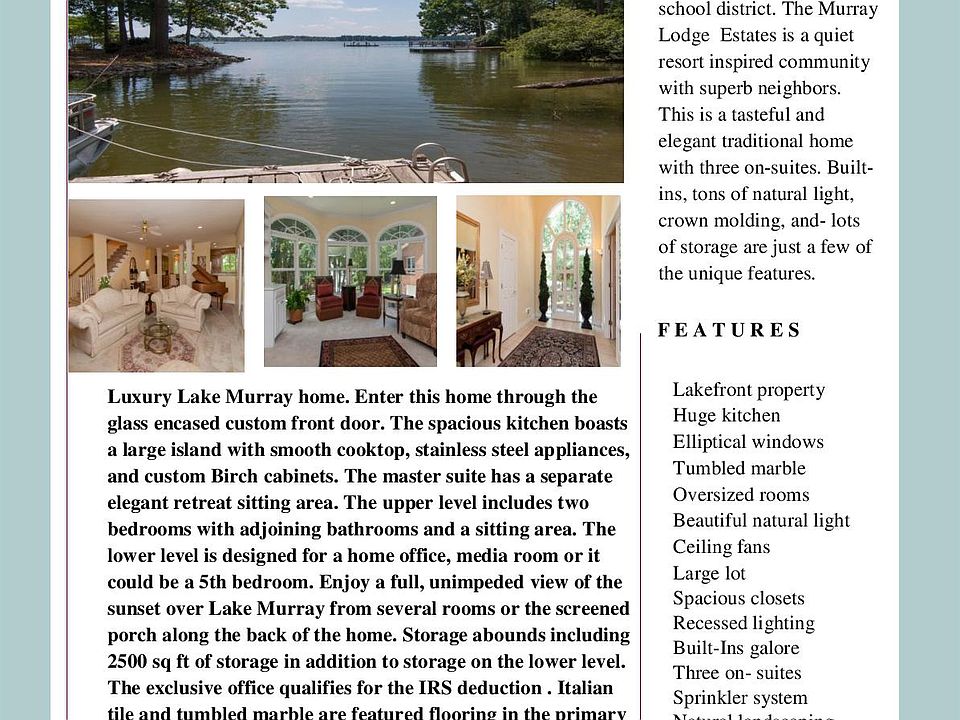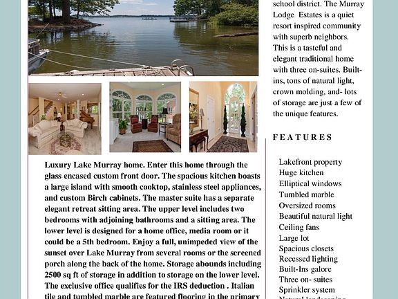 Luxury Lake Murray custom built home. Certified hard coat stucco with exceptional features and finishes. Enjoy a full, unimpeded view of the sunset over Lake Murray from most rooms or from the screened porch along the back of the home. Kitchen has custom Birch cabinets, large island with Jenn-Air cooktop, stainless appliances. Master suite has private sitting area retreat. Upper level is designed with guests in mind-each bedroom with private bath and a sitting area with coffee bar between. Lower level set up for office, media room, deluxe man cave, or 5th bedroom and walks out to patio and lake. Tons of storage, beautiful natural light, and SO much more. One of the best neighborhoods in Chapin! Beautiful dock