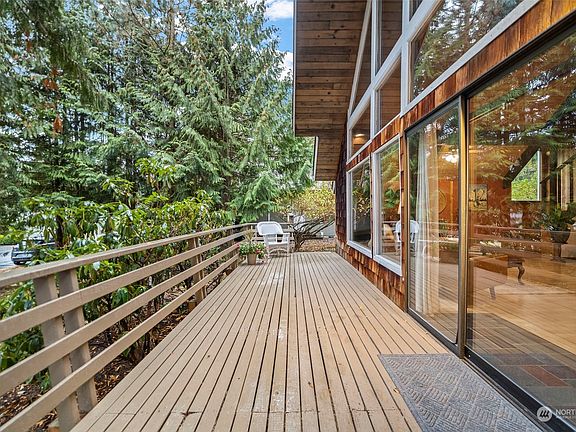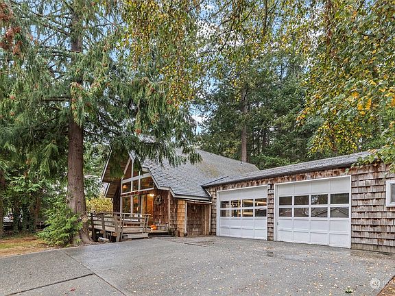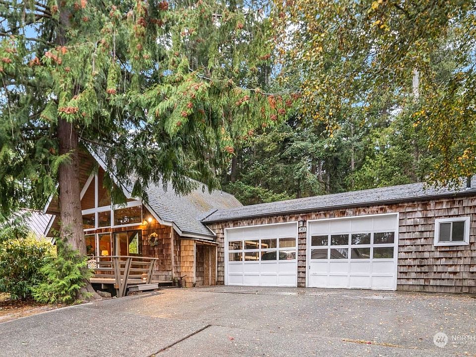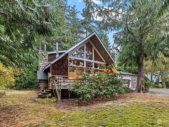 Chalet-style home full of charm & character in the beautiful area of Shelter Bay, La Conner. Enter into the great room with floor-to-ceiling windows & fireplace that flows into the open kitchen. Vaulted ceilings bring in a flood of natural light & airflow. 2 bedrooms & full bath w/ sauna on the main level. Primary bedroom w/ bathroom on upper level that leads to overlooking of the great room. Garage is perfect for parking or storage/workspace. On the other side of the garage, you will find an additional living space with bonus room, partial kitchen & bathroom! Private backyard that backs up to greenbelt. All centrally located to Shelter Bay amenities including pools, beaches, moorage, tennis courts & more!