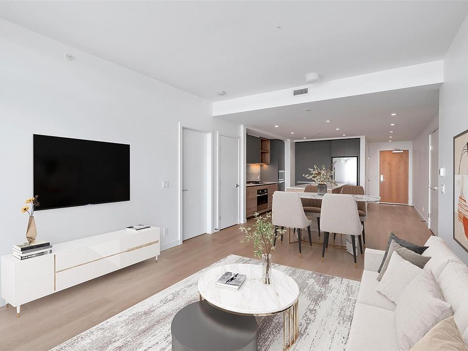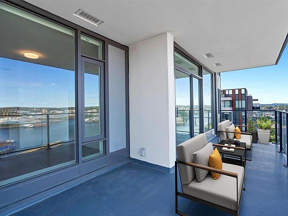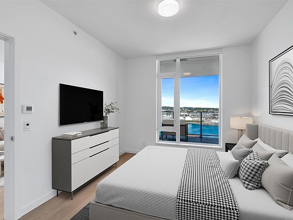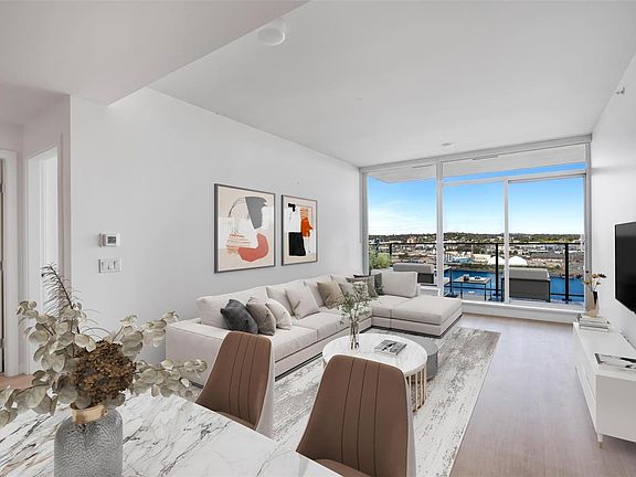 Experience Elevated Living in the Sky at Dockside Green by BOSA. This stunning 2-bedroom, 2-bathroom sub-penthouse offers panoramic views of the city skyline, ocean, and mountains — all from your expansive 179 sq ft balcony. Inside, the open-concept layout features a gourmet kitchen with a quartz island, gas range, and custom cabinetry — ideal for both daily living and entertaining. The primary suite includes a walk-through closet and spa-inspired ensuite, while the second bedroom and full bathroom are set apart for privacy. This home comes with one secure parking stall and a full-size storage locker. Enjoy top-tier amenities: a fitness centre, rooftop terrace with BBQs, social lounge, pet wash station, and bike storage. Steps to the Galloping Goose Trail, dining, cafés, and downtown. Pet-friendly, rental-friendly, and still under warranty — this is luxury, lifestyle, and location in one.