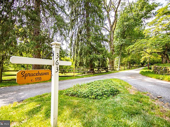 Welcome to 18th Century Sprucehaven Farm, on sprawling 7.2+/- acres in all its perennial glory. Most notably graced by its London Plane tree, the 6th largest in Pennsylvania. Construction of this stone coursed fieldstone Federal style estate, began c.1734. Owners demonstrate pride of ownership in their respect for its historical significance, coupled with effectively investing in quality upgrades and enduring enhancements to stand the test of time for years to come. Impressive Valleybrook entrance, a 315' long, flat setback befitting this stately property. Full length front porch. Charming center foyer fireplace & curved staircase. The hardwood floors throughout this home are magnificent. Authentic neutral colors on plaster walls w/ coordinating tones on woodwork & built-in cabinetry, deep sills throughout. Parlor living room to your right. A spacious Gathering Room to your left offering a generously sized wood fireplace, affords comfort for your entertaining. Formal dining room to the rear, leading to a large kitchen with updated quartz counters, stainless appliances, tile floor. Breakfast area with built ins & wood stove, plus an added ceiling fan, replaced skylight & rebuilt deck. Converted Four Season Sunroom with replaced energy efficient storm windows, tile flooring, propane stove, mounted mini-split heat pump, copper roof with interior wood accent ceiling, & 2023 Hunter Douglas 3/4 light filtering motorized duette shades with timer App! First floor Powder Room with stackable washer & dryer. All new storm doors. Storm windows have been replaced as well on the 1st & 2nd floors plus sliding doors (only) in eat in kitchen. Most roofs replaced including lower roofs on main house, office, barn, shed, & cistern. Second floor cozy & quaint En Suite BR/bath & added fireplace. Second En Suite BR & bath with bump out closet setting. Third bedroom & a thoroughly updated hall bath. The third floor has two generously sized bedrooms & a beautiful redesigned, rebuilt & repiped full bath. Bring your horses home for boarding and grazing, to a conversion of the bank barn into a 3 stall horse barn w/tack room & upper floor hay & feed storage. The approx 1/3 acre barnyard is intentionally outfitted with a special "dry lot" to prevent mud accumulation and erosion. Root cellar. Not one but two one acre (approx) pastures each with heavy duty no climb steel fencing with oak top boards and 4x4 post. Special pasture grass which grows early, faster, thicker, and deeper rooted. The Heather Lane entrance sports its own 3 car parking, & leads to a converted 1875 cow barn/carriage house, most recently upgraded as an approx. 1500 sq ft business office, with covered entrance, comfortable waiting room with powder room & two additional large rooms. Might you need a separate au pair suite or in law quarters instead? With a little additional conversion, voila! Provisions to this building are propane heat & electric A/C, septic tie in, well tie in, modern electrical service & wiring, separately metered & insulated. There is a three car detached garage with storage. Plus additional storage shed. A once unused well has been tapped at the bottom of the cistern, installed pump & water lines to service both the horse barn and the office. Installed is a complete septic system which serves the house and the office. Care and attention given to driveways, walkways, patio, stone walls. Installed heat pumps & ductwork for whole house HVAC. Installed whole house water softening system. Installed new circuit breaker box, whole house surge protector & wiring to allow a generator to provide service to major house systems. Additional BSM hook up for washer and dryer. This lovely 7+ acre property is bordered by Chester Heights Community Park! Convenient to shopping, dining, arts, medical needs. Also! Quick access to I-95, brand new Wawa Train Station, Airport, Philly, Wilmington and Shore Points. A perfect blend of yesterday, today and tomorrow awaits.
