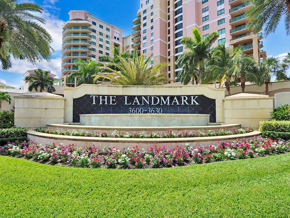 Enjoy scenic sunsets from this 4th floor unit at The Landmark. This 2 /2 1/2 Bath condo with high ceilings and marble floors has 1870 sq.ft. of living space. Open living and dining areas get plenty of light from tall sliding glass doors opening to a 320 sq.ft. balcony with a view of Lake Victoria. Kitchen has top of the line appliances, granite counters, generous cabinet space and passthrough bar/counter. Bedrooms with Berber carpeting have custom designed closets and spacious En-Suite Baths. Laundry room with full size washer and dryer has bonus cabinets. Amenities include 24 hour valet, concierge service, pool/sundeck, fitness center, game and media rooms, BBQ area with Putting and Bocce Ball, Library and Social Room. Best location and Pet Friendly! Welcome Home to the Landmark!