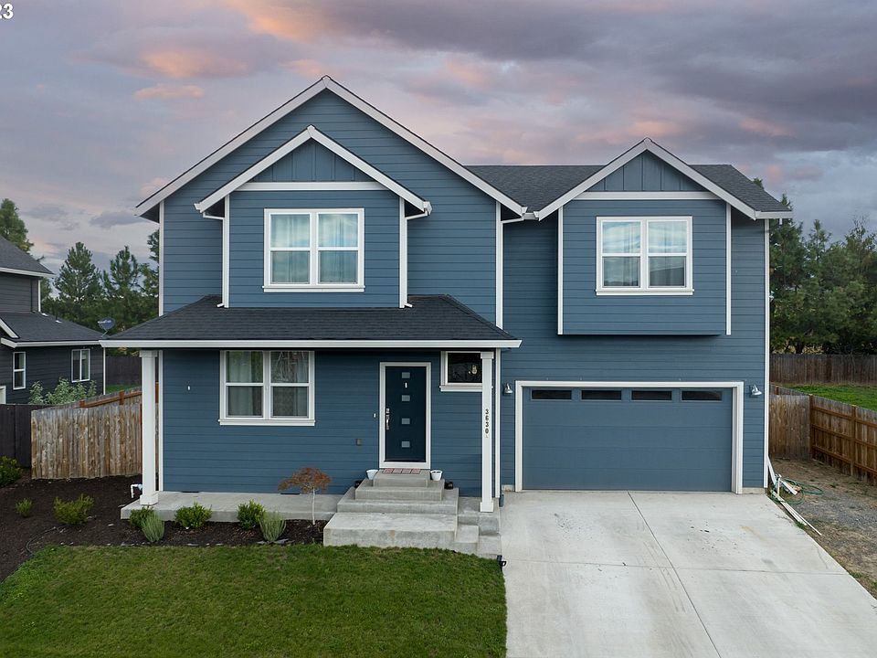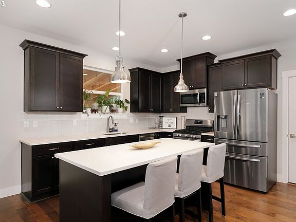 Newer 2-story home with a Mt. Hood view. Inviting floor plan, featuring 4 bedrooms, 2.5 bathrooms, and a 2-car garage. This property offers engineered hardwood floors and tile in bathrooms & laundry room. The kitchen boasts stainless steel appliances, quartz counters & island. Open floor plan & a living room with a gas fireplace that adds warmth and charm. Outside, a large fenced backyard with a partially covered patio that provides ample space for outdoor activities & entertaining.