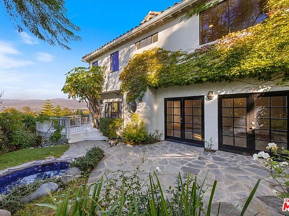 This exquisite 4-bedroom, 3.5-bathroom home, located in a 6 home gated community, high up in the serene hills of Studio City south of Ventura Boulevard. Enjoy breathtaking panoramic views of the Valley all the way to the Santa Susana mountains. The updated kitchen boasts high-end appliances, including a Bosch dishwasher, Thermador induction cooktop, oven, and microwave, a KitchenAid refrigerator and trash compactor. The formal dining room is filled with natural light and offers a gorgeous view of the outside deck, which overlooks the hillside and features a built-in BBQ and refrigerator perfect for gatherings with friends and family. The spacious living room features a charming brick fireplace. Designed for entertaining, the family room includes a river rock fireplace, wet bar, wine cooler, and French doors that open to an in-ground waterfall spa, easily controlled with Aquatic control technology, and surrounded by a lush grassy area. The enormous primary suite features a brick fireplace, dual walk-in closets, an en suite bathroom with double vanity sinks, a separate water closet, a walk-in shower, a large soaking tub, and a balcony with stunning valley and mountain views. Additional amenities include a 3-car garage with extra parking for three more vehicles on the driveway, an alarm system, Nest thermostat, and a ChargePoint Home Flex Level 2 EV Charger. Perfect for those seeking privacy and tranquility, the property is surrounded by large hedges and spa/fountain features, creating a peaceful escape from city life. Enjoy close proximity to trendy restaurants and chic boutiques, all within the desirable Carpenter School District.