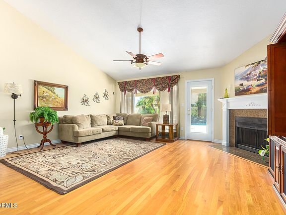 Welcome to this charming 2-bedroom home + Den ( easily convert back to 3rd bedroom), boasting convenient RV parking. Discover vaulted ceilings and wood-look flooring, creating an inviting atmosphere. The living and dining area offers comfort and warmth with its cozy fireplace, perfect for family gatherings. Culinary enthusiasts will delight in the eat-in kitchen with a breakfast nook, white cabinetry, SS appliances, a pantry, glossy counters. The main bedroom features a private exit, an ensuite, and a walk-in closet. In the garage, find built-in cabinets for extra storage. Outside, the covered patio presents a serene backdrop for relaxation, while the lush grass, sparkling pool, and spa invite endless enjoyment. This gem is sure to capture your heart and exceed your expectations