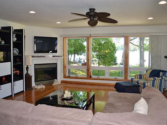 Cedar Lake Great place to make Family Memories in this Charming year round home on Cedar Lake. Fabulous new kitchen, plenty of cabinets, Coirian counter tops, stainless steel appliances, open view overlooking large 20 x 20 living room surrounded by windows to give you a great outdoor view. Gas log fireplace has a controlled thermostat., wood flooring thru out living room, kitchen, and dining area. Large pantry off the dining area, 2 bedroom with a possible 3rd bedroom downstairs, and full bath, full basement leads to a two car garage. Nicely landscaped grounds, Large shade trees, Pontoon boat and roll in dock all included with property. This is a very well maintained property. Property is Exempt from Flood Insurance