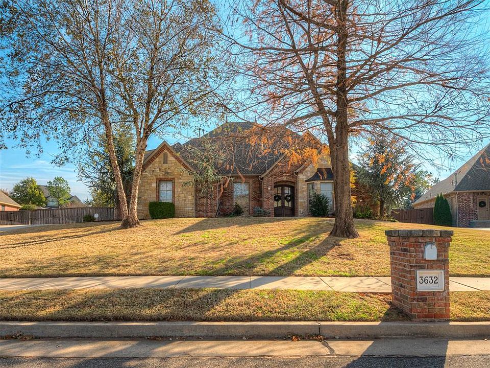 Welcome home to this beautifully updated, move-in-ready property located on a picturesque street in one of Edmond’s most desirable neighborhoods. This incredible floor plan offers a study, formal dining room, large family room, bonus room, and four bedrooms, including a peaceful primary suite located downstairs. The study features floor-to-ceiling bookcases and French doors, while the formal dining room and entry showcase newly refinished hardwood floors. The kitchen is truly the heart of the home, offering brand-new countertops, a large center island with prep sink, double ovens, stainless steel appliances, granite accents, a butler’s pantry, and its own fireplace. The breakfast area overlooks the backyard and opens seamlessly to the spacious living room with a second fireplace. The primary suite includes beautiful windows, a relaxing bathroom with soaking tub, walk-in shower, and an impressive closet. Upstairs, you will find three generous secondary bedrooms and a versatile media or game room perfect for movie nights or gatherings. Additional features include a utility room with sink and mud bench, new carpet upstairs, epoxy flooring in all garages, an in-ground storm shelter, and a half bath located in the third-car garage. The home sits on a large, beautifully landscaped lot with a spacious patio and pergola overlooking the generous backyard. This exceptional property offers comfort, style, and functionality throughout. Don’t miss the opportunity to live in this outstanding Edmond home.