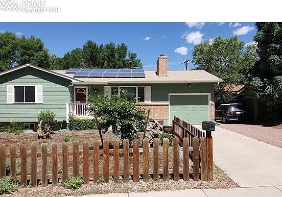 This District 11 home has what you are looking for. Eco friendly counter tops and solar panels featuring net metering. The wood burning fireplace in the basement is great for the cold winter nights and the central air will keep you cool in the summer. Welcome to your beautiful District 11 Garden Ranch home encompassing 3 bedrooms, a bonus room, 2 bathrooms, and a oversized 1 car garage with 1843 finished square feet of substantial living space. As you enter, you are greeted with beautiful laminate hardwood floors and warm inviting paint, creating an eternal style. Forget your stresses with a good book while you relax in the deep soaking bath tub. Your eat-in kitchen features 42 inch cabinets and eco friendly solid surface counter tops. All of the kitchen appliances stay and the stove was purchased in 2013. From the kitchen you can walkout to your fenced backyard show casing xeroscaped landscaping and a yard that will be perfect for entertaining with your covered flagstone patio. Your home features newer windows, coverings, roof and a whole house humidification system. Your upstairs has two bedrooms with original hardwood floors and the bathroom features updated tile, a comfort height commode and solid counter tops. The finished basement provides extra living space you want with a bedroom, bonus room and bathroom. This home is perfectly situated to enjoy the close proximity to schools, shopping, military bases, I-25 and UCCS. Start your journey by making your appointment today and wind up HOME.