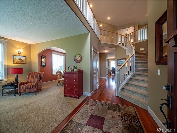 Immaculate quality home on scenic property w/ valley views. Upgraded finishes & attention to detail throughout: Cherry wood floors entry to kitchen, wood blinds, custom woodwork, built-in speakers & vacuum syst., covered deck area w/ gas bbq hook-up, extra parking, oversize garage & more. Gourmet kitchen: SS appliances, island, granite counters, pantry & eating area. Luxurious master suite-deck, fireplace, lg. walk-in closet & jet tub.